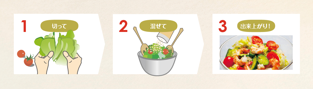 レタス、きゅうり、トマトなど、お好みの野菜を食べやすい大きさに切り、本品を入れてよく混ぜ合わせます。