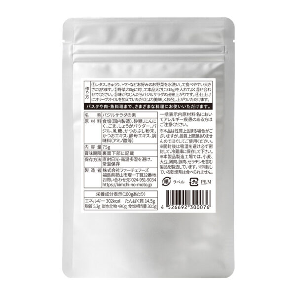 原材料:食塩(国内製造)、砂糖、粉末にんにく、ごま、しょうがパウダー、バジル、乳糖、かつおぶし粉末、かつおエキス、酵母エキス/調味料(アミノ酸等)